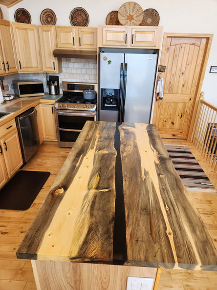 This bold kitchen centerpiece features local wood slabs seamlessly joined with a matte black epoxy river. The rich, natural tones complement the cabinetry while offering a functional and durable surface.